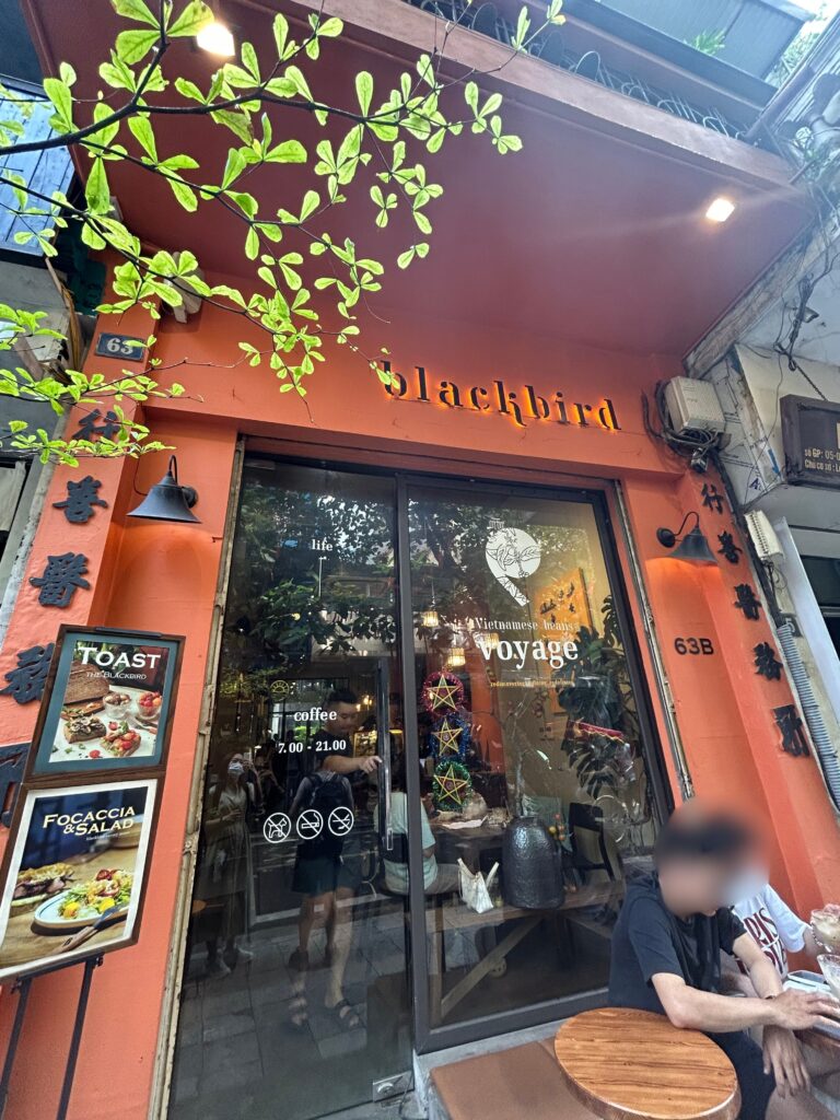 Blackbird Coffeeは、ハノイ市内にあるスタイリッシュな雰囲気のカフェ。漢方屋が並ぶランオン通り沿いにあり、他の店とは一味違う落ち着いたオレンジが目印です。