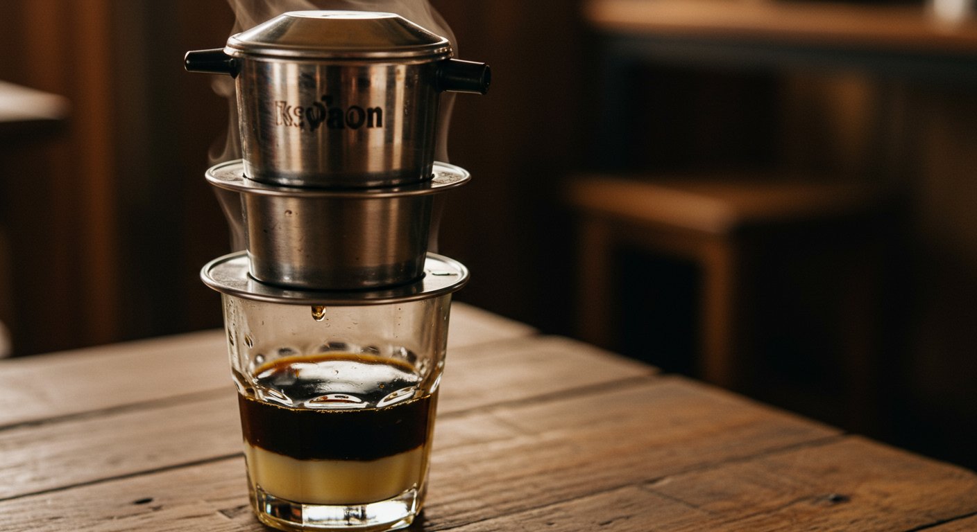 ベトナムのコーヒー文化の最大の特徴は、独自の抽出器具「フィン」を使った淹れ方にあります。このアルミ製のドリッパーでゆっくりと抽出される一滴一滴が、深い味わいを生み出すのです。そして甘いコンデンスミルクと合わさることで、独特の風味が完成します。