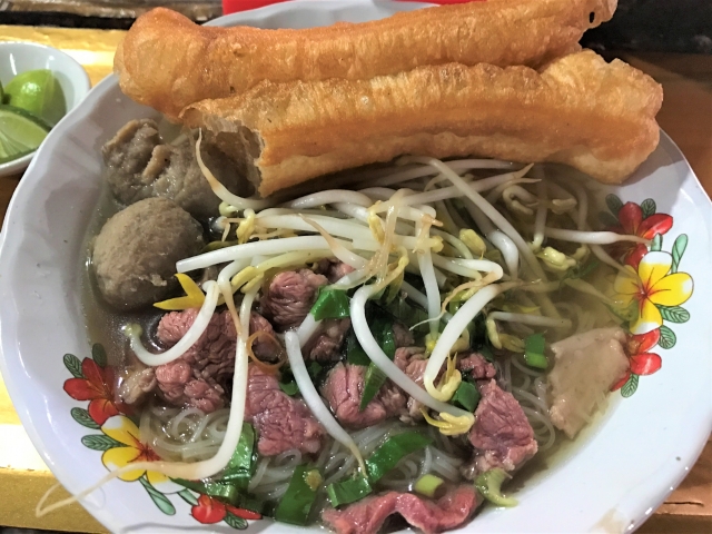 「クアイ(Quay)」とよばれる揚げパンをトッピングして、フォーのスープに浸して食べるとまた格別です。多くの店では、別で注文する必要があり、5,000ドン(約30円)が相場です。