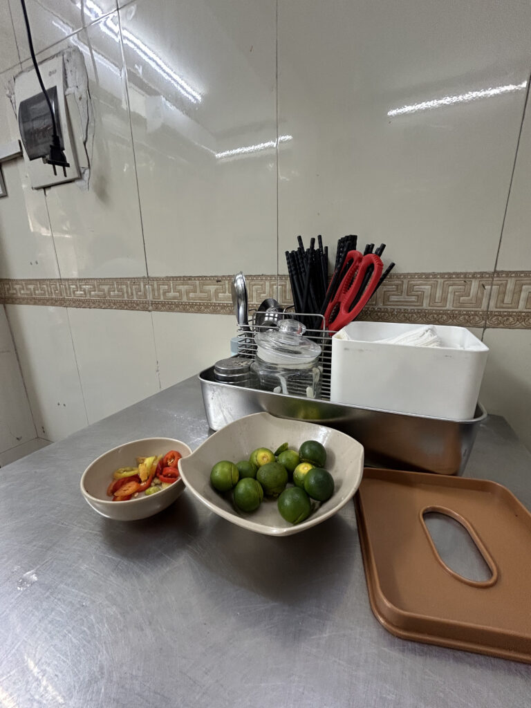 テーブルに調味料(ニンニク酢・唐辛子・ライム)があっても、最初は何も加えずにスープを一口飲んでみてください。